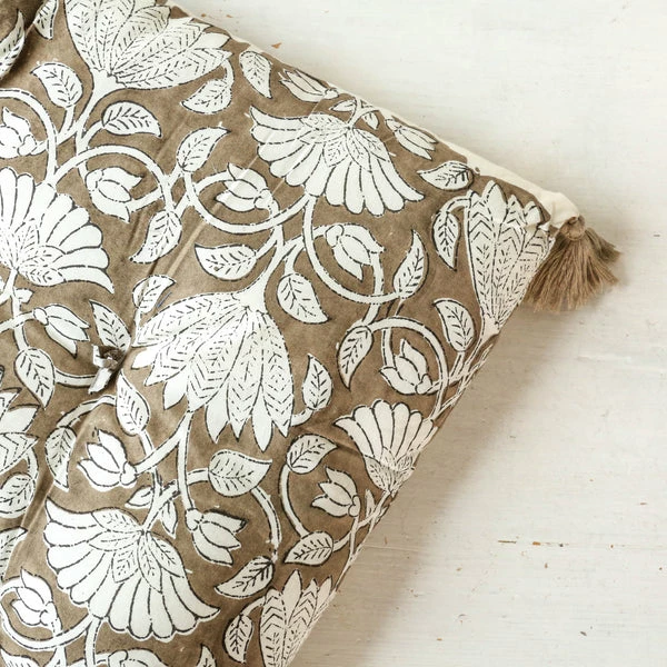Beautiful soft mattress stye double cushion, perfect for carrying out to the garden this summer, these mattresses will work perfectly with outdoor benches and chairs and indoors on occasional chairs Tassel detail to corners. Outer 100% block printed Indian cotton with poly filling. Mattress measures 50 x 155 x 7 cm Dry cleaning is recommended, avoid direct sunlight.
