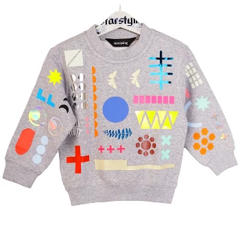 Unisex kids sweater with different forms and colors allover. Handmade unique items. Every sweater looks different. Please take a look at the samples to get an impression of the forms and colors.