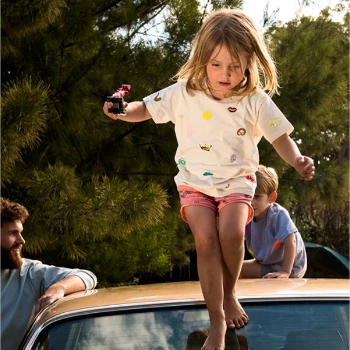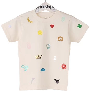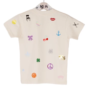 The Kids “Tutti Frutti” T-Shirt in Natural. Unisex kids T-Shirt with multicolored motives on the front and backside. Every item is unique! Handprinted in out Berlin starstyling studios. 100% Cotton.