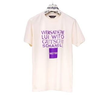 The “Brands” T-Shirt in natural with purple printed lettering. Unisex sizing, straight cut. Hand printed at our starstyling studios in Berlin. Wersatsche, Lui Wito, Gutschi, Schanell, Wettmo. 100% Cotton.