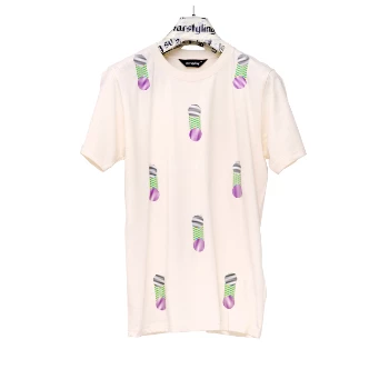 The “Molecules” T-Shirt in Natural. Straight wide cut. Unisex sizing. Many molecules on the front and one big one on the back. Hand printed with foil print at our starstyling studios in Berlin. 100% Cotton.